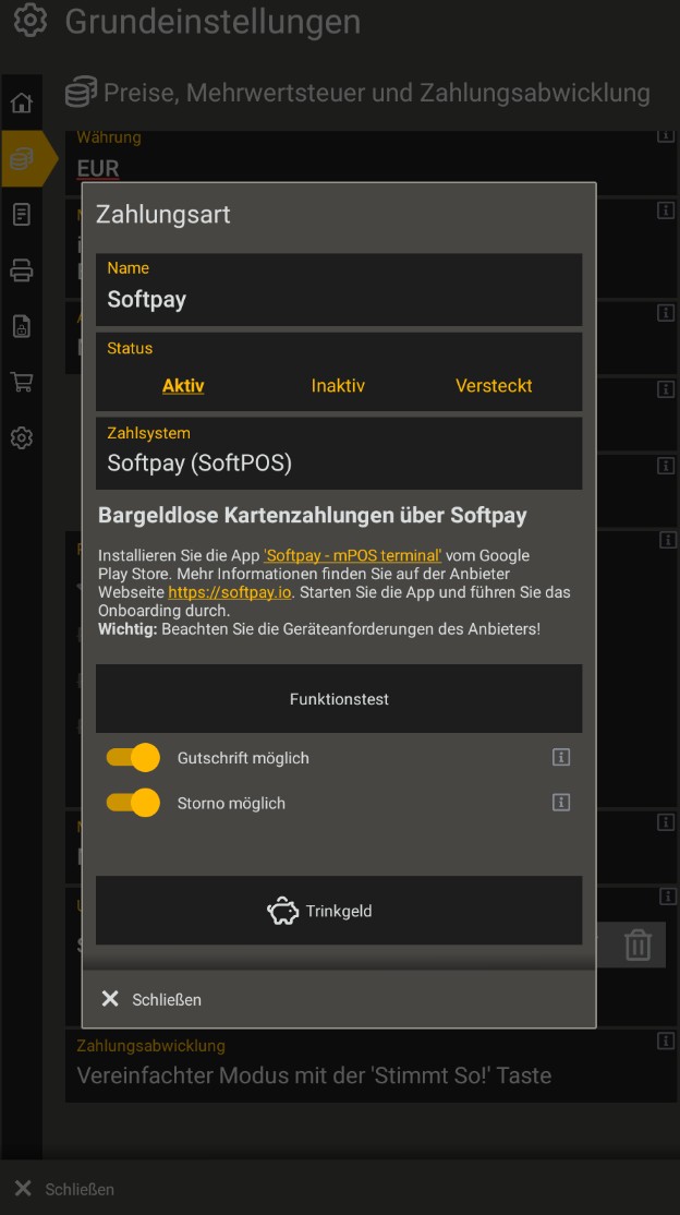 Wählen Sie als Zahlsystem den Eintrag "Softpay (SoftPOS)" aus.