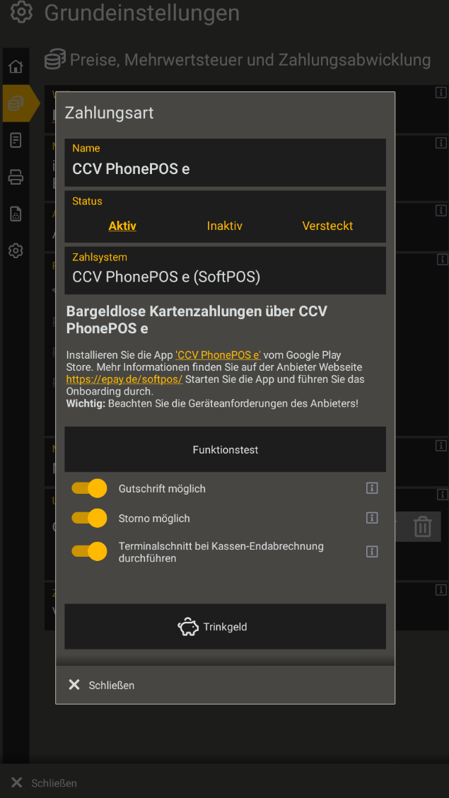 Wählen Sie als Zahlsystem den Eintrag "CCV PhonePOS e (SoftPOS)" aus.