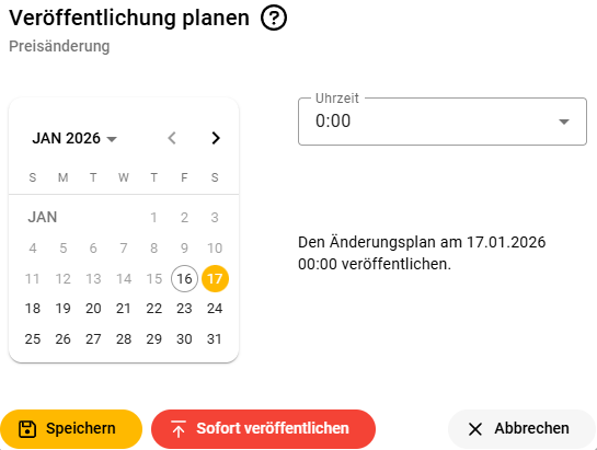 Wahlweise können Sie jetzt den Änderungsplan sofort veröffentlichen oder ein zukünftiges Datum und Uhrzeit (stundenweise) für die geplante Veröffentlichung wählen. Zum Veröffentlichungszeitpunkt werden die angepassten Daten dann automatisch auf die betroffenen Kassen übertragen. Sollten die Kassen zu diesem Zeitpunkt ausgeschaltet oder nicht mit dem Internet verbunden sein, werden die Änderungen automatisch übertragen sobald wieder eine Internetverbindung besteht.