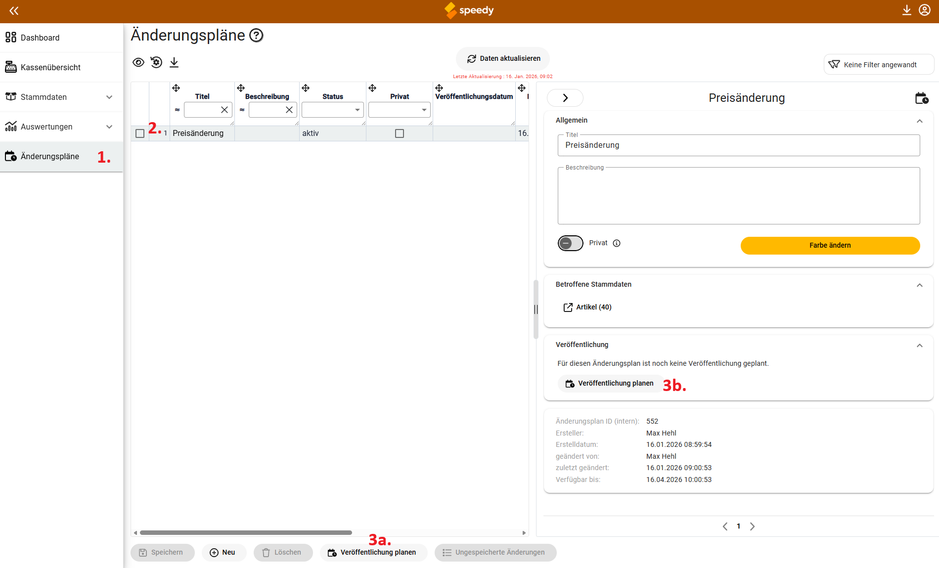 Navigieren Sie über das Menü (Screenshot 1.) zu der Seite Änderungspläne. Wählen Sie danach den Änderungsplan aus, den Sie veröffentlichen möchten (Screenshot 2.). Klicken Sie dann auf Veröffentlichung planen, entweder unter der Tabelle in der Operationsleiste (Screenshot 3a.) oder über die Detailansicht rechts (Screenshot 3b.), sofern Sie diese eingeblendet haben.