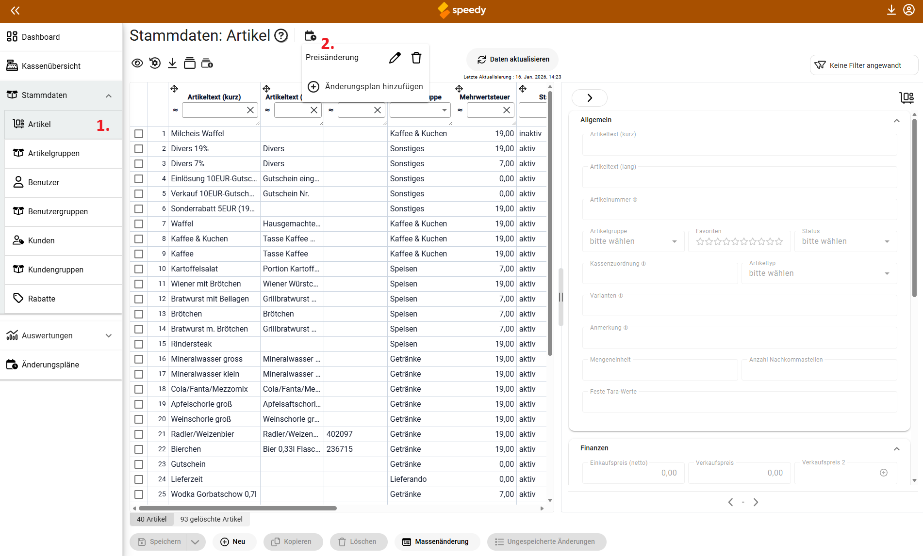 Navigieren Sie dafür zu den Stammdaten, z.B. Artikeln (Screenshot 1.), und wählen Sie dort den gewünschten Änderungsplan aus (Screenshot 2.).